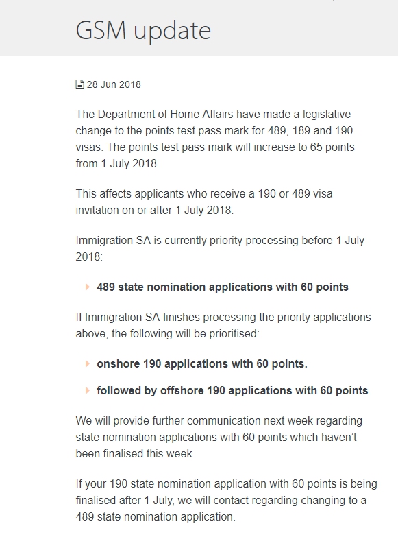 SA: 因為我本身住SA,所以對於SA的擔保條件更能體會。簡單來說,SA是所有澳洲州政府最佛新的一州。2018年6月 28日(四)聯邦政府宣布調整移民分數,從60分調漲到65分,當下SA政府就做出以下公告,優先審理60分489申請人還有在南澳60分的境內申請人,當其他州政府都不做任何調整的時候,南澳移民局的工作人員,當天開始跟周末強力加班,努力讓申請人有機會來南澳,真的是要好好替他們鼓勵一下!