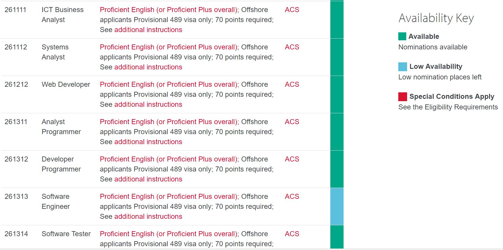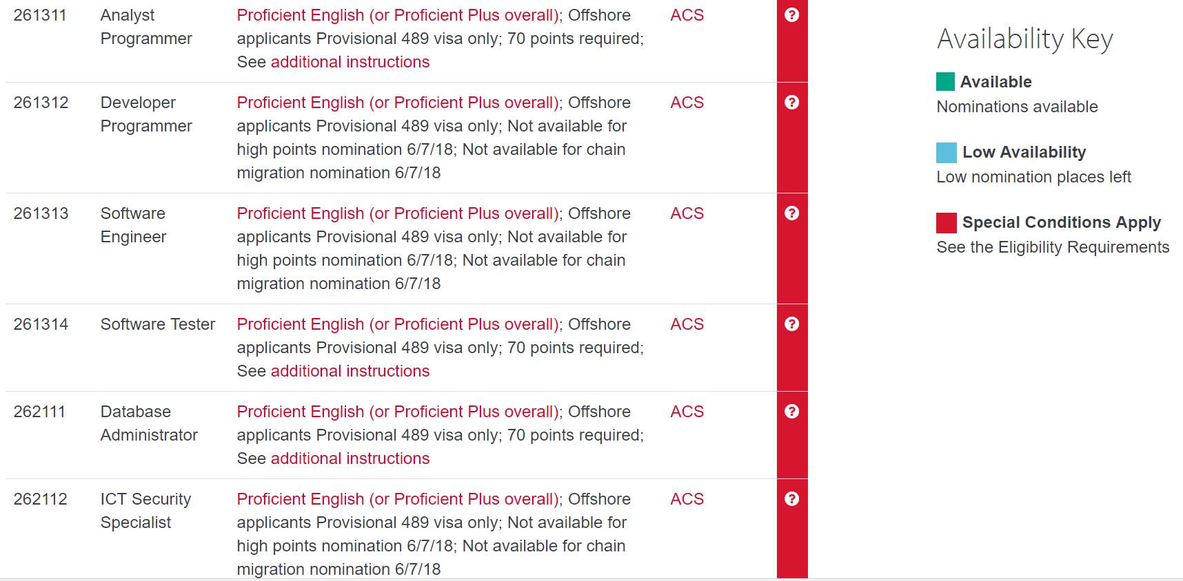 舉例來說,IT相關職業是澳洲所有州裡面申請人可以”主動申請”的州,南澳2018-2019的清單在05/07/2018下午4點左右公佈,當天晚上我幫一個software engineer的客人申請時,已經變成low availability 。隔天早上06/07我開電腦的時候,已經額滿了!